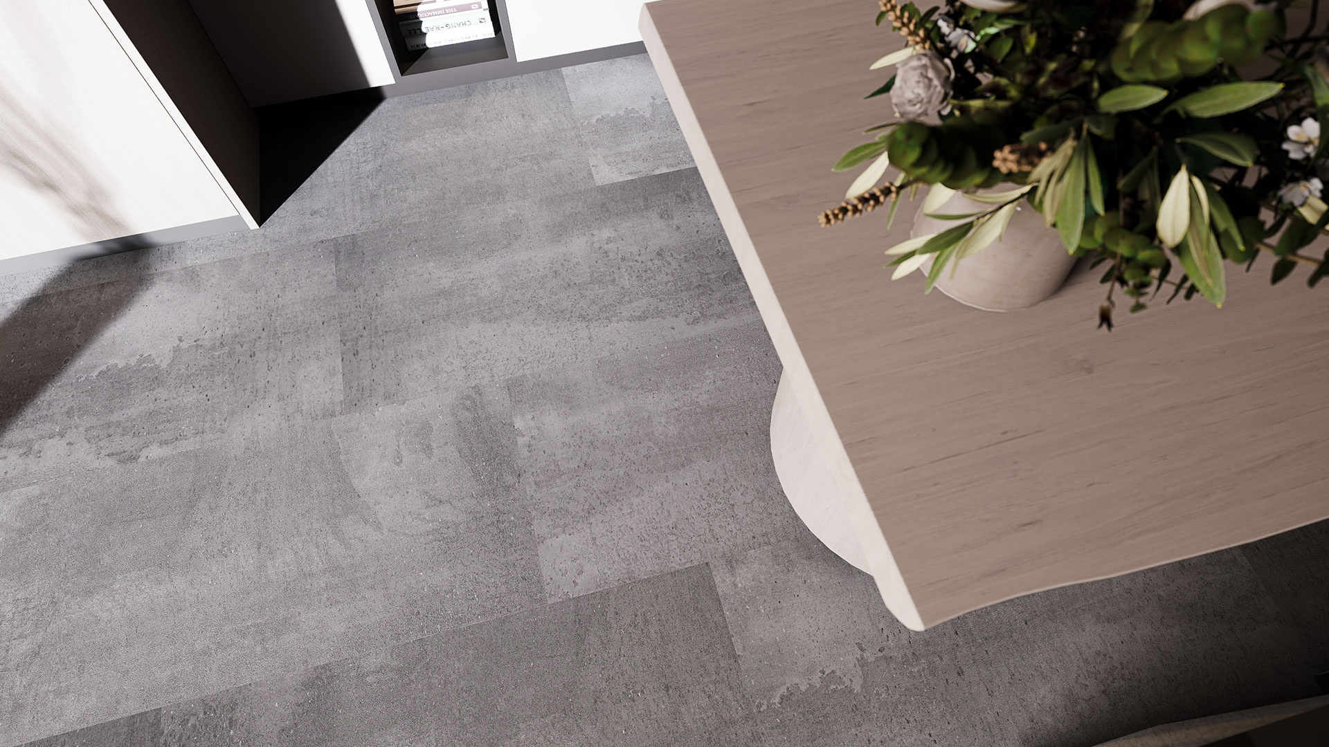 Cemento colato, grigio medio monolitico. Nuvolature controllate e lievi segni di cassero: aspetto ordinato e contemporaneo. Evoca getti in opera, geometrie ortogonali, ritmo metropolitano.